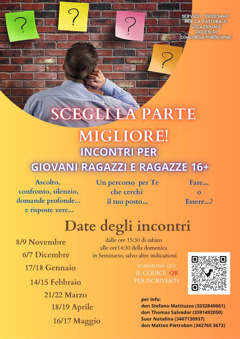 Scegli la parte migliore! Il Servizio per la Pastorale Vocazionale propone anche quest’anno un cammino di discernimento rivolto a giovani che desiderano interrogarsi sul proprio futuro e sulla chiamata che il Signore rivolge loro.Un’occasione per fermarsi, ascoltare, confrontarsi e fare silenzio, per lasciarsi raggiungere da domande profonde e scoprire risposte vere. Gli incontri si terranno in Seminario Diocesano, dalle 15.30 del sabato alle 14.30 della … Continua a leggere »
