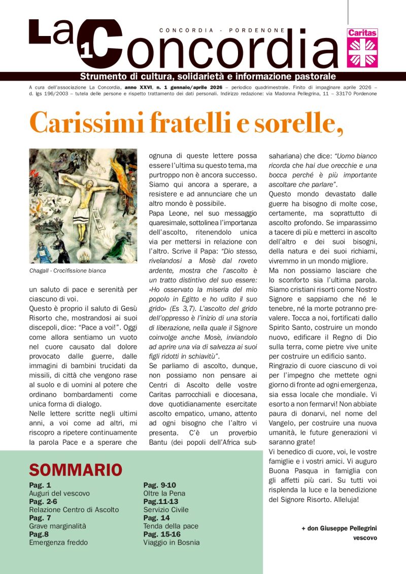 SCADENZA PROROGATA AL 16 APRILE 2026 ORE 14.00 È ancora attivo il bando di Servizio Civile Universale per la selezione di 65.964 operatori volontari da impiegare in 2.635 progetti da realizzarsi in Italia e 204 progetti da realizzarsi all’estero. La scadenza è stata prorogata al 16 aprile 2026 ore 14.00. La Caritas Diocesana di Concordia-Pordenone ha attivi 8 POSTI in 4 diversi progetti. Prima … Continue reading