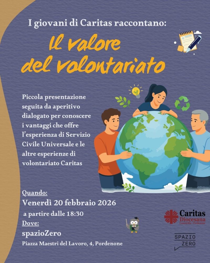 Venerdì 20 febbraio 2026, a partire dalle ore 18.30, presso SpazioZero (Piazza Maestri del Lavoro 4, Pordenone), i giovani impegnati nella Caritas Diocesana di Concordia-Pordenone proporranno un momento di incontro e condivisione dedicato al valore del volontariato.