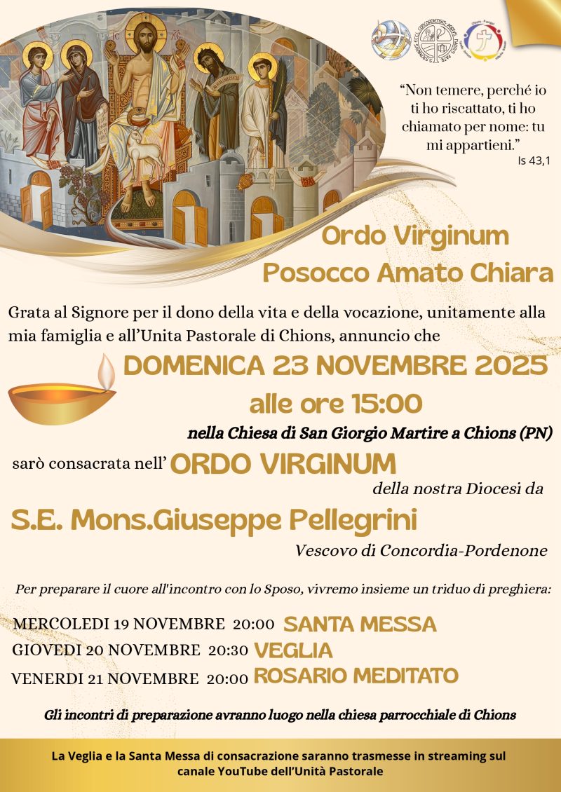 Consacrazione nell’Ordo Virginum di Chiara Posocco Amato Domenica 23 novembre 2025, alle ore 15.00, nella Chiesa di San Giorgio Martire a Chions (PN), Chiara Posocco Amato verrà consacrata nell’Ordo Virginum della Diocesi di Concordia-Pordenone per l’imposizione delle mani e la preghiera consacratoria di S.E. Mons. Giuseppe Pellegrini, Vescovo diocesano. L’annuncio nasce da un profondo sentimento di gratitudine al Signore per il dono della vita e della … Continua a leggere »