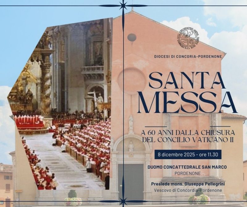 La Diocesi di Concordia-Pordenone celebrerà il 60° anniversario della conclusione del Concilio Vaticano II con una Santa Messa presieduta dal Vescovo mons. Giuseppe Pellegrini, in programma lunedì 8 dicembre 2025 alle ore 11.30 nel Duomo Concattedrale San Marco di Pordenone. Il Concilio Vaticano II rappresenta uno spartiacque nella storia della Chiesa: un evento che ha restituito slancio missionario, aperto nuove vie di dialogo e rinnovato … Continua a leggere »