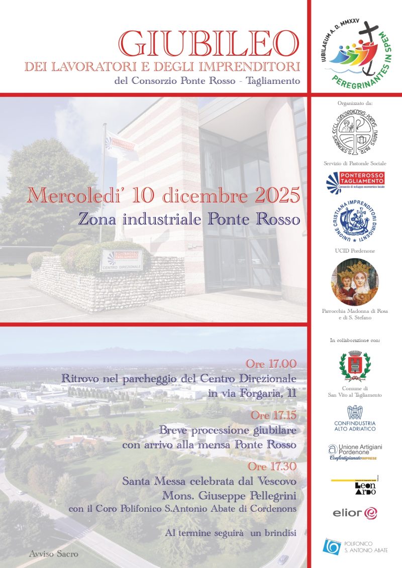Mercoledì 10 dicembre si terrà nella zona industriale Ponte Rosso–Tagliamento il Giubileo dei lavoratori e degli imprenditori, un appuntamento che unisce fede, impegno sociale e testimonianza quotidiana nel mondo del lavoro. Il ritrovo è fissato alle 17.15 nel piazzale del Centro Direzionale in via Forgaria 11. Da qui partirà il cammino verso la sala mensa, passando sotto l’arco giubilare. Alle 17.30 il Vescovo mons. Giuseppe … Continua a leggere »
