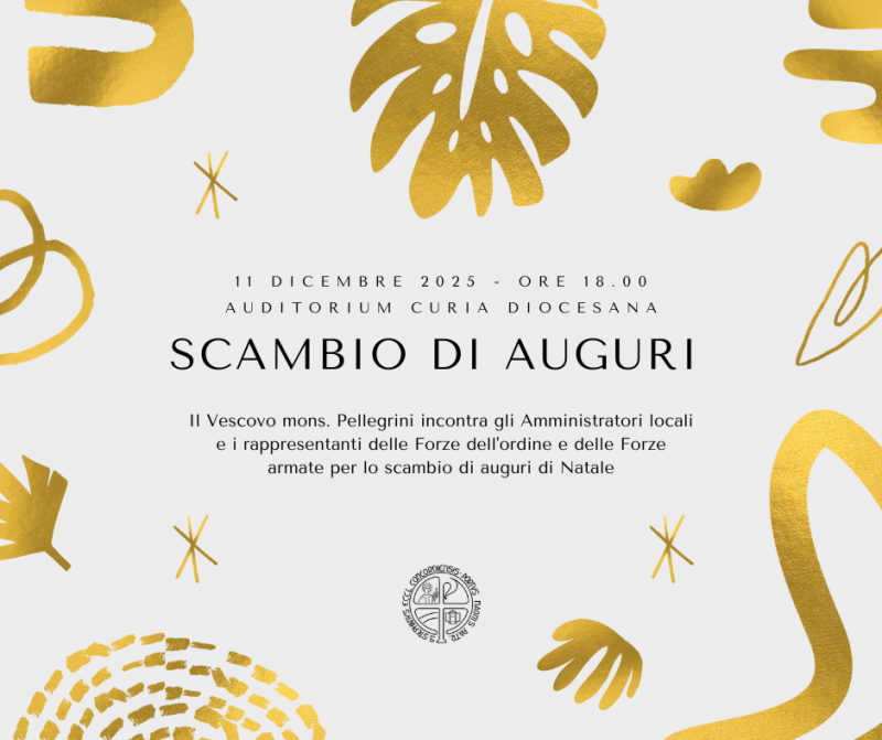 Giovedì 11 dicembre alle ore 18.00, nella sala del Centro diocesano attività pastorali in via Revedole, il Vescovo mons. Giuseppe Pellegrini incontrerà gli Amministratori locali e i rappresentanti delle Forze dell’ordine e delle Forze armate per il tradizionale scambio degli auguri di Natale.Un momento semplice e significativo, nel quale la comunità ecclesiale desidera esprimere vicinanza, gratitudine e sostegno a chi quotidianamente è impegnato per il … Continua a leggere »