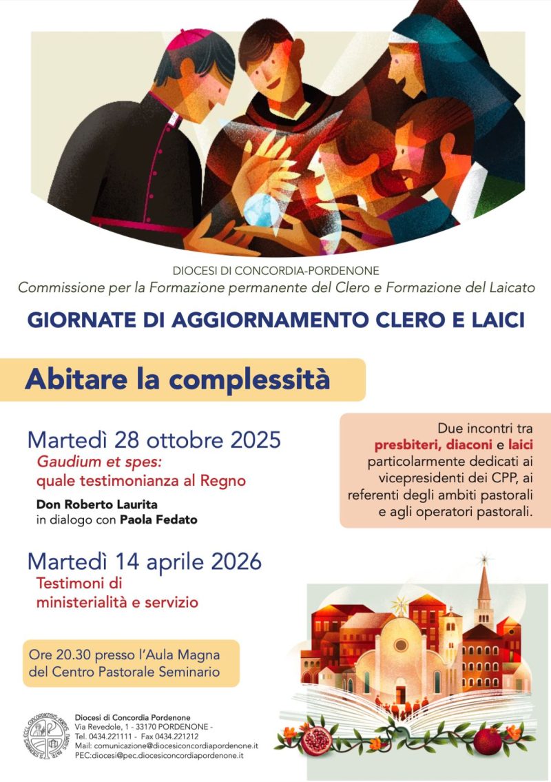 Giornate di aggiornamento per clero e laici – “Abitare la complessità” La Diocesi di Concordia-Pordenone, attraverso la Commissione per la Formazione permanente del Clero e la Formazione del Laicato, propone anche per quest’anno due giornate di aggiornamento rivolte a presbiteri, diaconi e laici, con particolare attenzione a vicepresidenti dei Consigli Pastorali Parrocchiali, referenti degli ambiti pastorali e operatori pastorali. Il tema che farà da filo … Continua a leggere »