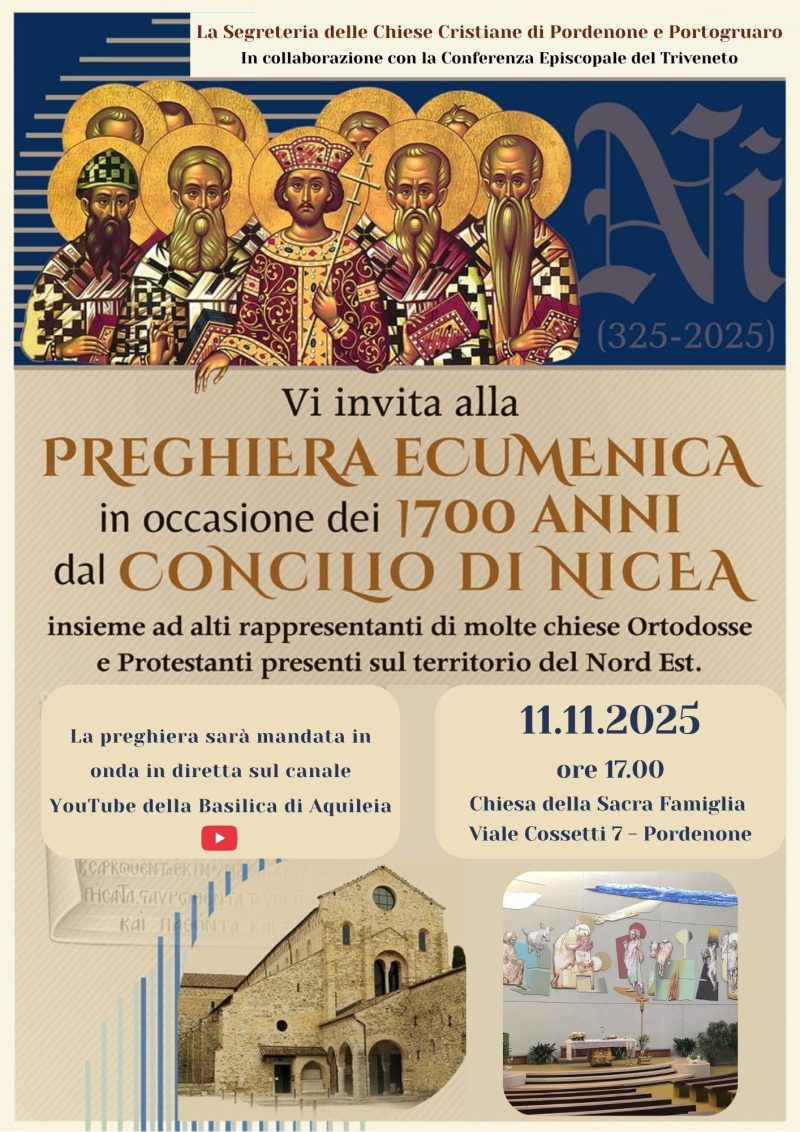 Veglia Ecumenica a Pordenone: 1700 Anni dal Concilio di Nicea In occasione dello storico 1700° anniversario del Concilio di Nicea (325-2025), la città di Pordenone ospiterà un solenne momento di preghiera ecumenica. L’evento, organizzato dalla Segreteria delle Chiese Cristiane di Pordenone e Portogruaro, in collaborazione con la Conferenza Episcopale del Triveneto, si terrà: Data: Martedì 11 novembre 2025 Ora: 17:00 Luogo: Chiesa della Sacra Famiglia … Continua a leggere »