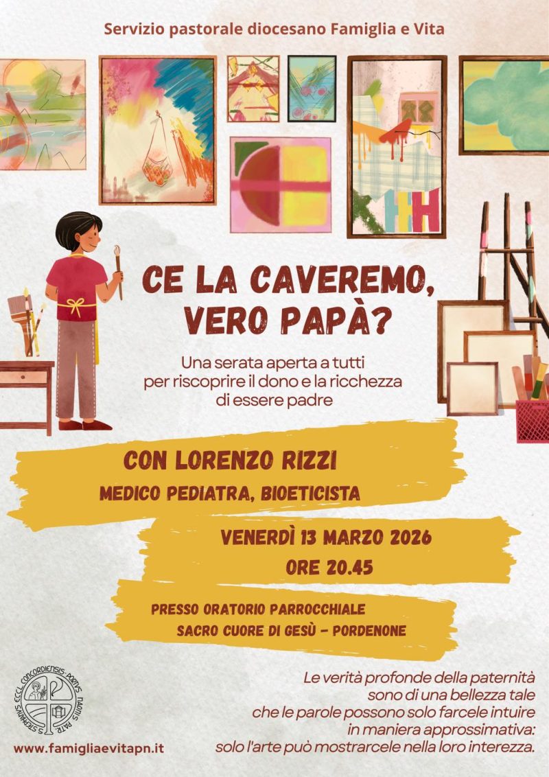 Venerdì 13 marzo 2026, alle ore 20.45, presso l’oratorio parrocchiale del Sacro Cuore di Gesù a Pordenone, si terrà l’incontro dal titolo “Ce la caveremo, vero papà?”, un’occasione per riscoprire il dono e la ricchezza dell’essere padre.