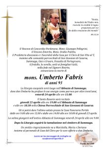 Il Vescovo di Concordia-Pordenone, mons. Giuseppe Pellegrini, il Vescovo Emerito mons. Ovidio Poletto, il Presbiterio diocesano, assieme ai familiari annunciano nella fede nel Signore Risorto la morte di don Umberto Fabris di 93 anni.