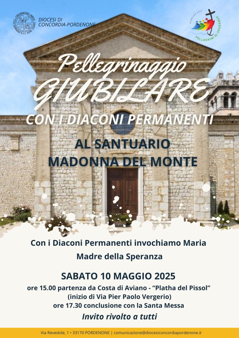 Si terrà il prossimo 10 maggio con partenza alle ore 15.00 da Costa di Aviano – “Platha del Pissol” (Inizio di Via Pier Paolo Vergerio) con brevi soste alla Chiesetta di San Valentino ed ai capitelli della Via di Maria, e arrivo al Santuario della Madonna del Monte dove, dopo la recita dei Vespri, si concluderà con la celebrazione della Santa Messa delle ore 17.30.