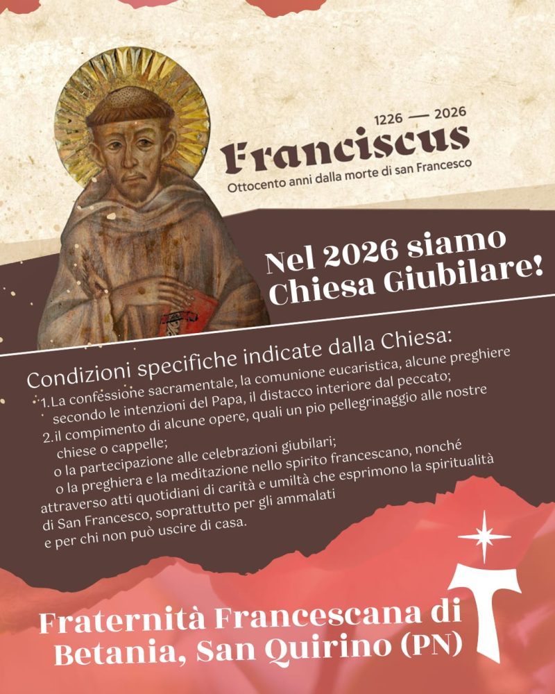 In questo contesto, la Fraternità Francescana di Betania di San Quirino (PN) sarà Chiesa Giubilare: un luogo in cui i fedeli potranno vivere un cammino di conversione e ricevere l’indulgenza giubilare secondo le condizioni indicate dalla Chiesa.