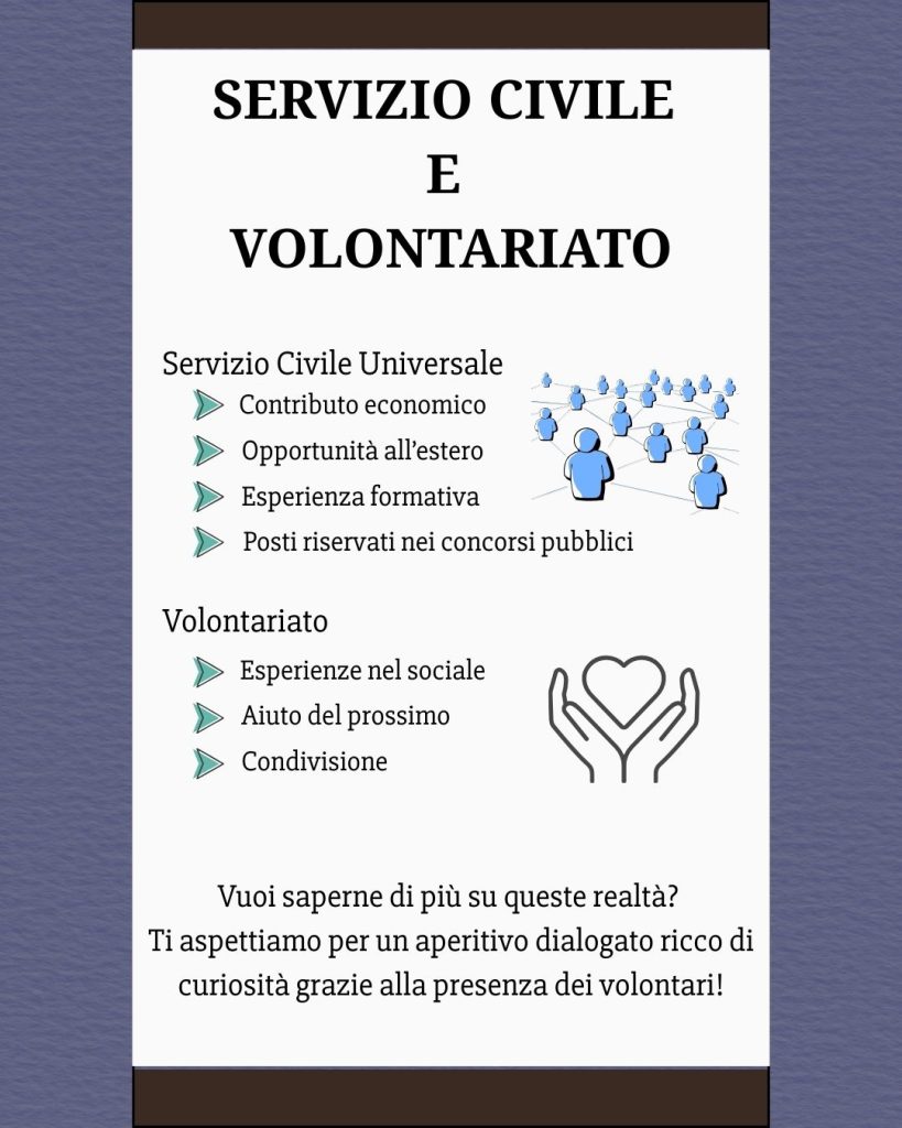 La serata prevede una breve presentazione delle esperienze in atto — in particolare del Servizio Civile Universale e delle altre opportunità di volontariato promosse da Caritas — seguita da un aperitivo dialogato, spazio informale di confronto in cui sarà possibile fare domande, conoscere più da vicino le attività e scoprire i vantaggi umani, formativi e professionali che l’esperienza di servizio può offrire.