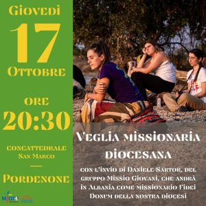 Giovedì 17 ottobre, alle 20.30 in Concattedrale San Marco, durante la consueta Veglia Missionaria, Daniele riceverà dal nostro vescovo Giuseppe il mandato missionario come Fidei Donum. Sarà un momento ecclesiale bello ed emozionante al quale siamo invitati a partecipare. La Veglia sarà interamente animata dal gruppo “Missio Giovani”.
