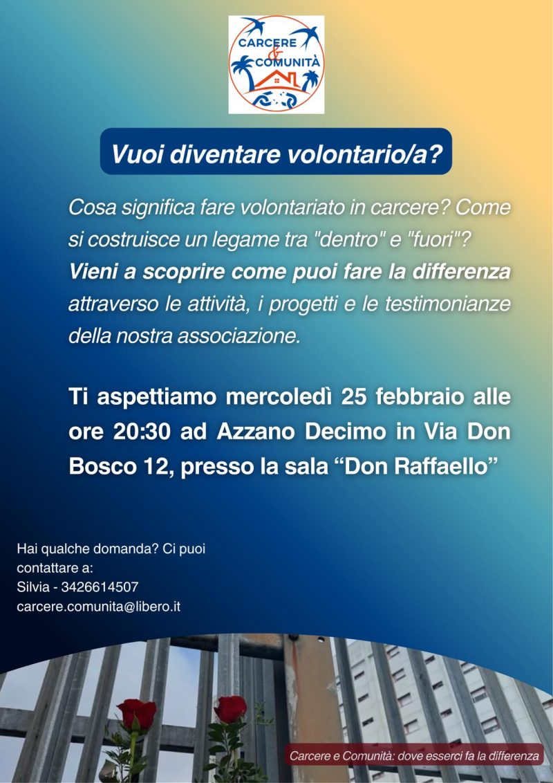 La serata si terrà martedì 25 febbraio alle ore 20.30 presso l’oratorio di Azzano Decimo e sarà un’occasione per conoscere più da vicino l’associazione “Carcere e Comunità”, le attività svolte e le modalità per diventare membri attivi.